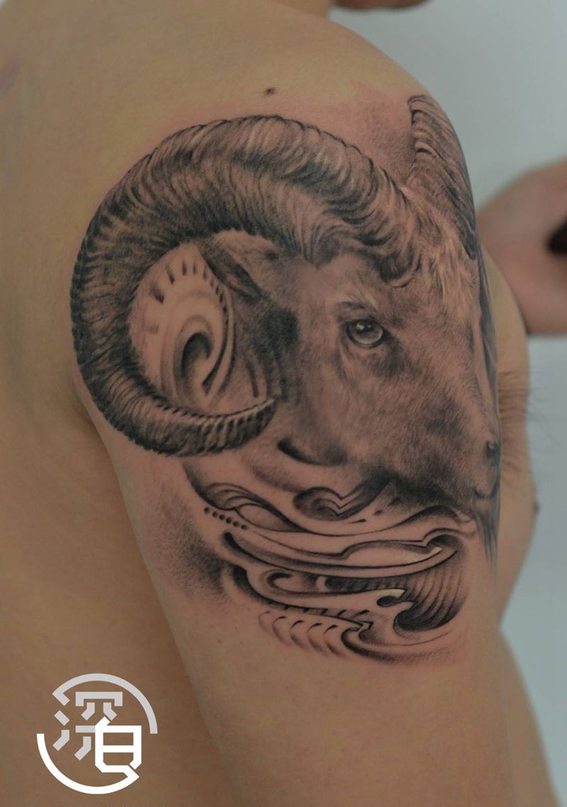 当前位置: 首页 >湖南省长沙市纹身店-深白刺青纹身图案>羊首纹身图片_手臂手部欧美写实几何羊纹身图案