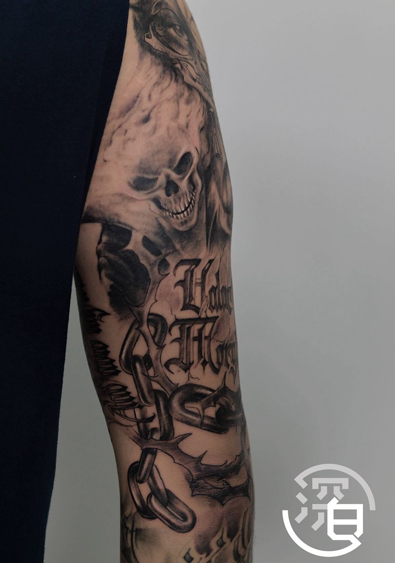 当前位置: 首页 >湖南省长沙市纹身店-深白刺青纹身图案>暗黑花臂局部纹身图片_手臂手部欧美写实暗黑乌鸦锁链纹身图案