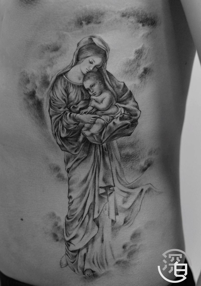 当前位置: 首页 >湖南省长沙市纹身店-深白刺青纹身图案>圣母纹身图片_腰部欧美写实圣母纹身图案