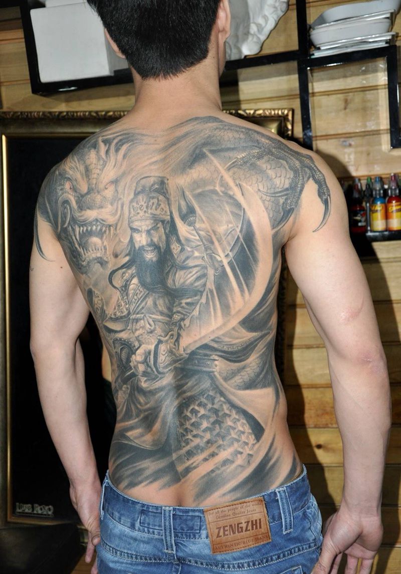 《龙斩》恢复三年后纹身图片_背部成品人物传统关公关羽纹身图案