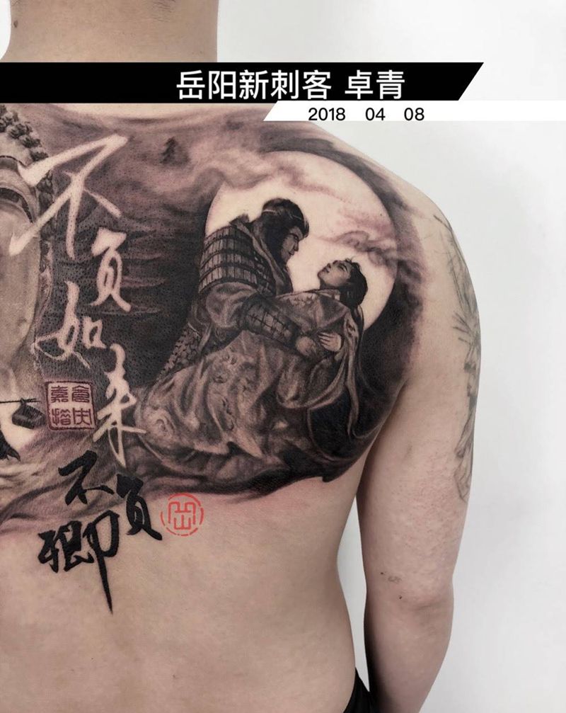 当前位置: 首页 >湖南省岳阳市纹身店-岳阳新刺客纹身图案>卓青作品纹身图片_成品背部写实传统肖像原创人物情侣猴子纹身图案