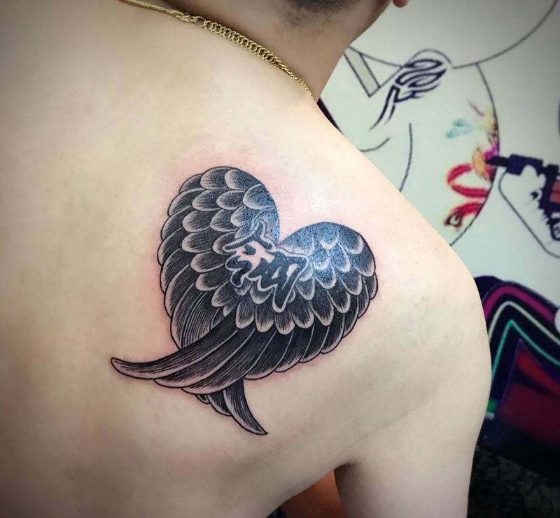 翅膀➕爱女名字纹身图片_成品肩部背部传统字符静物纹身图案