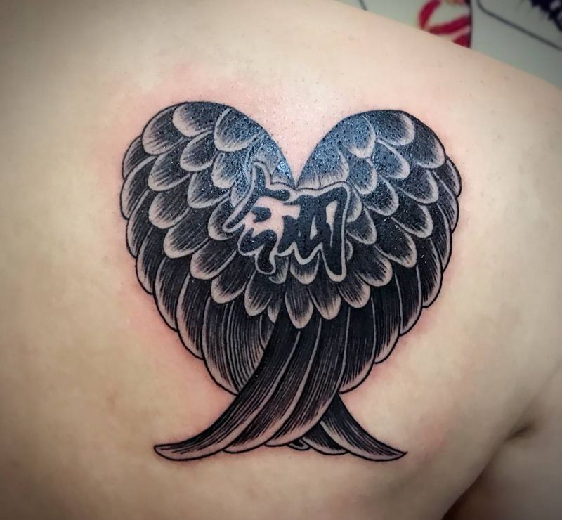 翅膀➕爱女名字纹身图片_成品肩部背部传统字符静物纹身图案