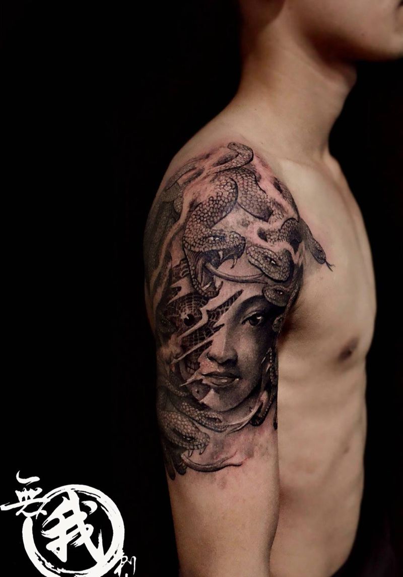 当前位置: 首页 >广东省广州市纹身店-广州纹身無我刺青tattoo纹身图案>美杜莎原创作品纹身图片_鬼神原创人物宗教欧美写实手部手臂成品手稿纹身图案