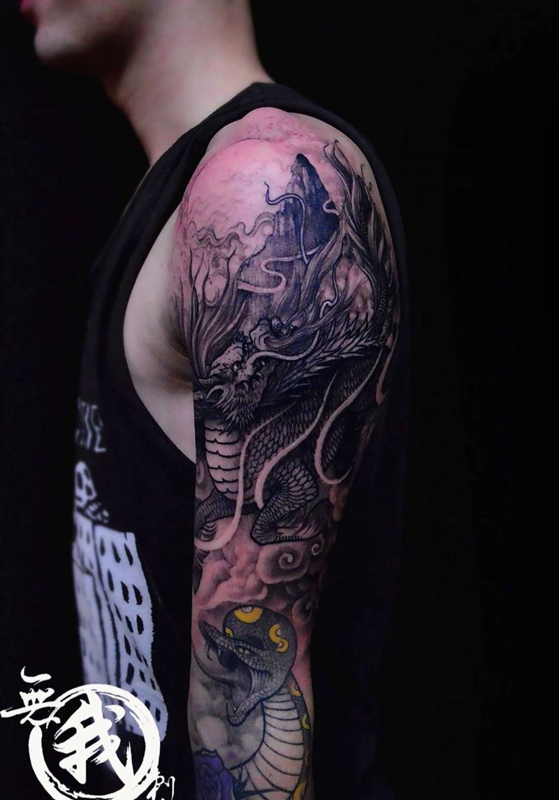 • T网红王老大花腿龙纹身图片_腿部新传统纹身图案