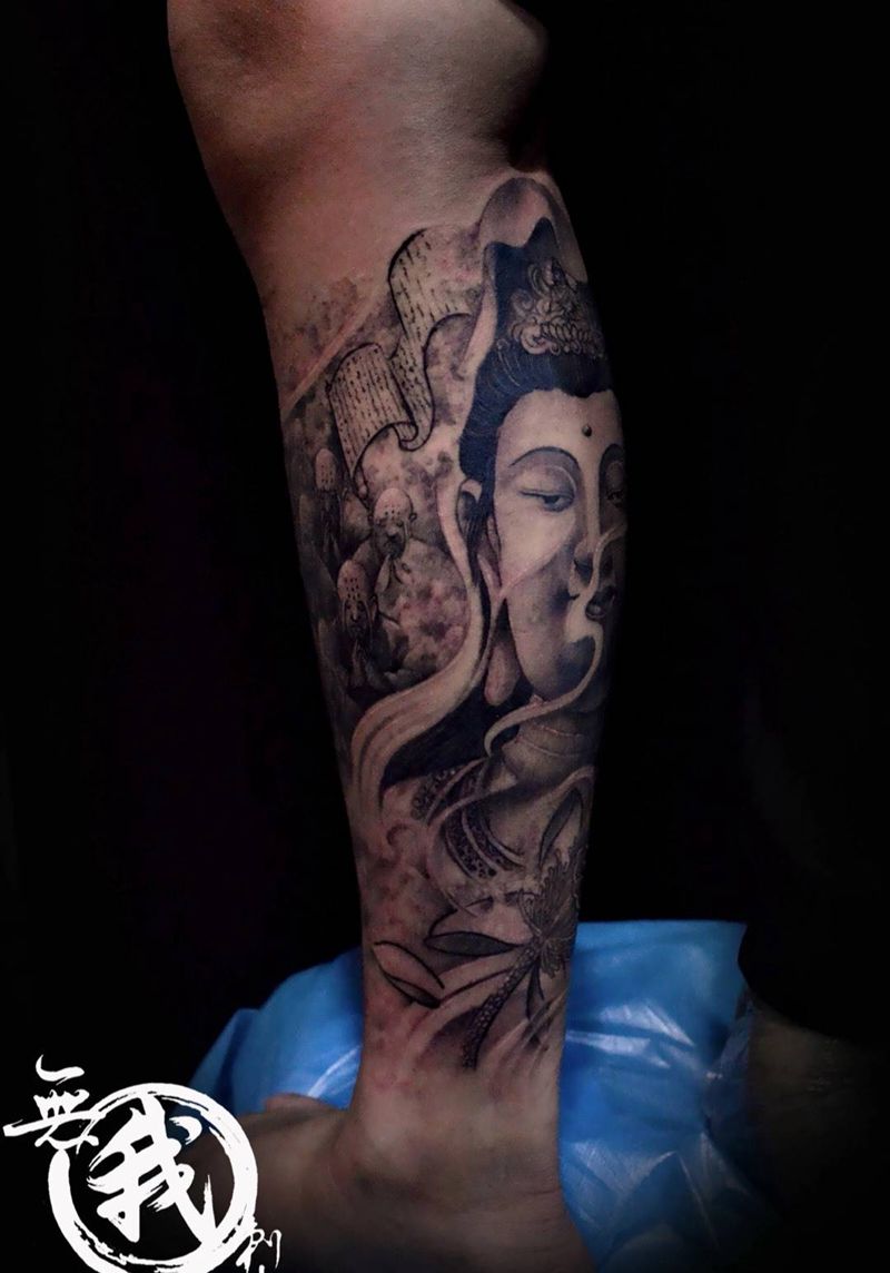 当前位置: 首页 >广东省广州市纹身店-广州纹身無我刺青tattoo纹身图案>佛包小腿纹身图片_传统肖像成品手稿脚部腿部宗教鬼神人物纹身图案
