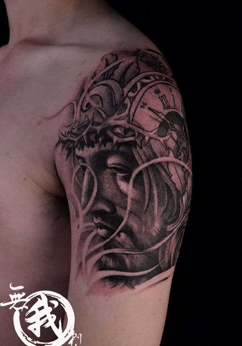 当前位置: 首页 >广东省广州市纹身店-广州纹身無我刺青tattoo纹身图案>耶稣钟表纹身图片_欧美肖像写实手部手臂成品手稿插画宗教人物纹身图案