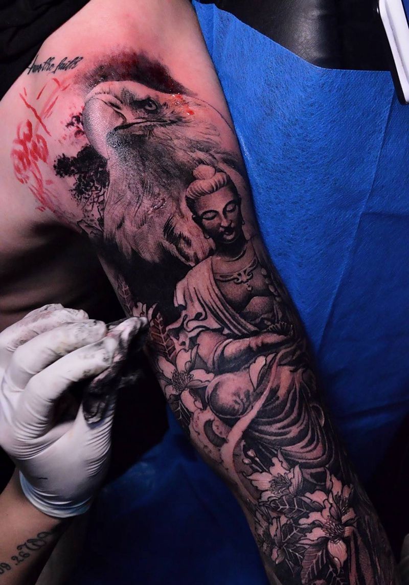 当前位置: 首页 >广东省广州市纹身店-广州纹身無我刺青tattoo纹身图案>花臂纹身图片_成品手稿手臂欧美写实肖像人物宗教动物原创纹身图案