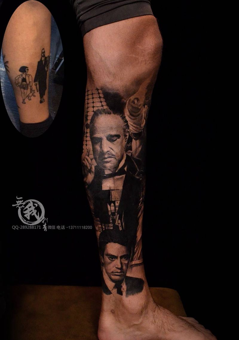 小腿版教父 【添加遮盖】纹身图片_成品手稿腿部欧美写实肖像人物植物纹身图案
