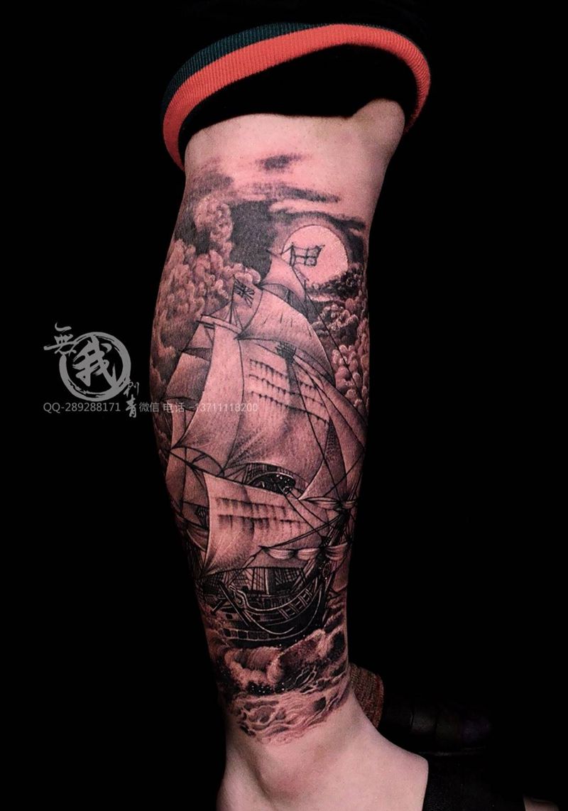 帆船纹身图片_成品手稿腿部欧美写实原创纹身图案
