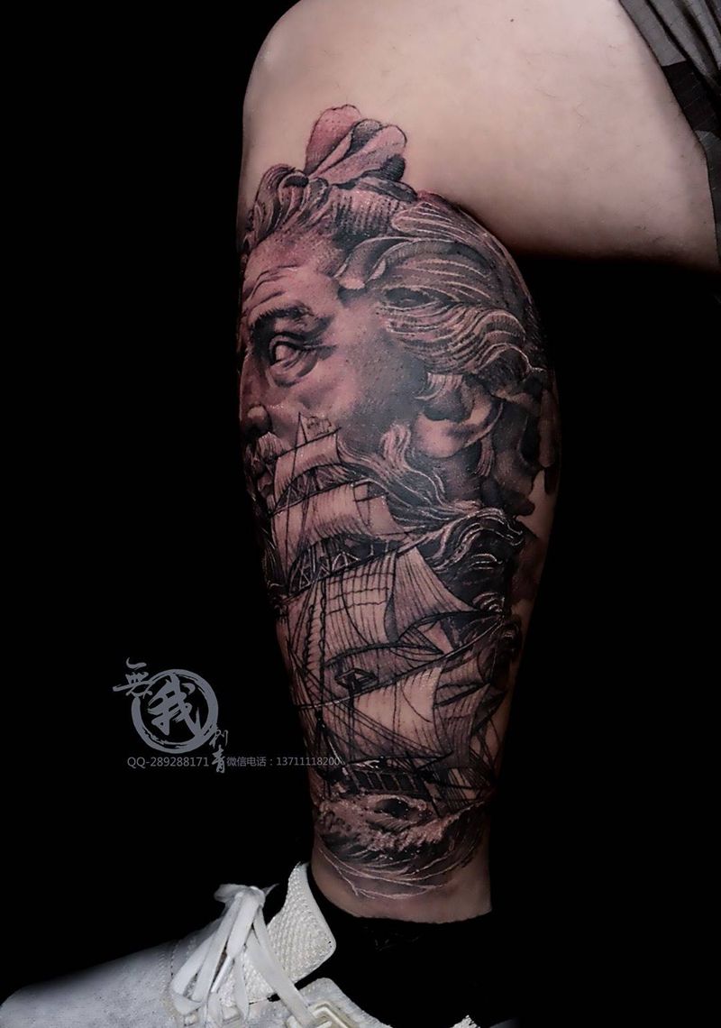 当前位置: 首页 >广东省广州市纹身店-广州纹身無我刺青tattoo纹身图案>海神纹身图片_成品手稿腿部欧美写实肖像人物原创鬼神纹身图案