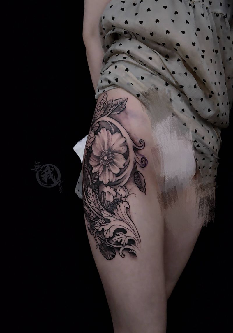 大腿花纹身图片_臀部腿部欧美写实花纹身图案
