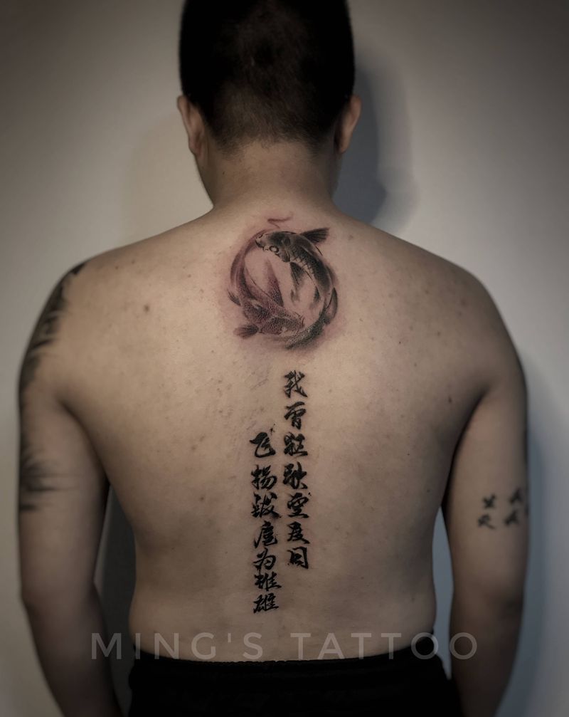 书法纹身图片_背部水墨书法鱼太极纹身图案