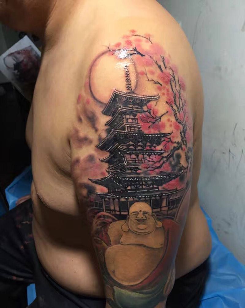 宝塔。纹身图片_传统手臂成品鬼神宗教纹身图案