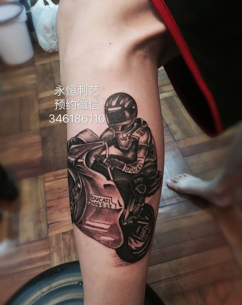 当前位置: 首页 >广东省广州市纹身店-永恒刺艺艺术纹身纹身图案>机车纹身图片_成品腿部写实原创纹身图案