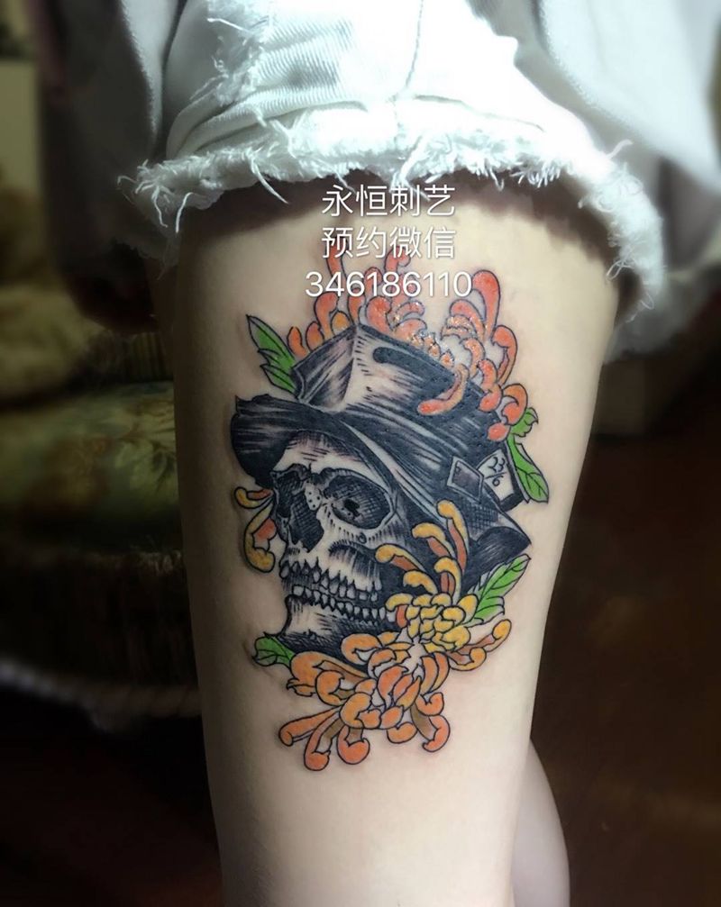 骷髅纹身图片_成品腿部清新欧美人物纹身图案
