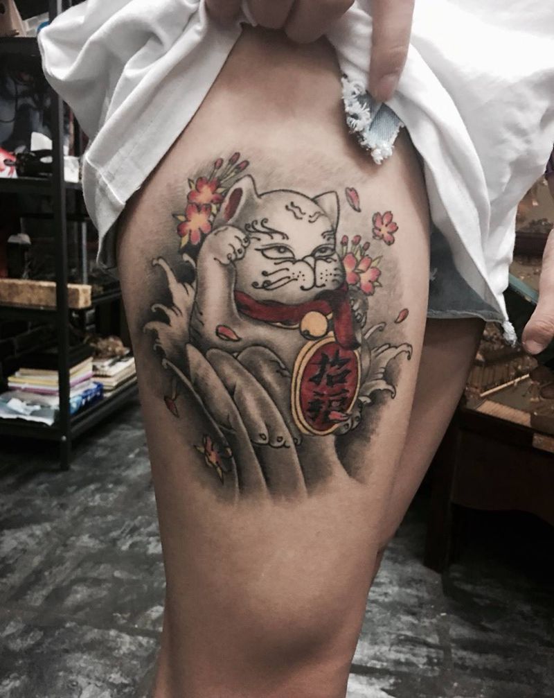 招财猫纹身图片_成品腿部习俗动物纹身图案