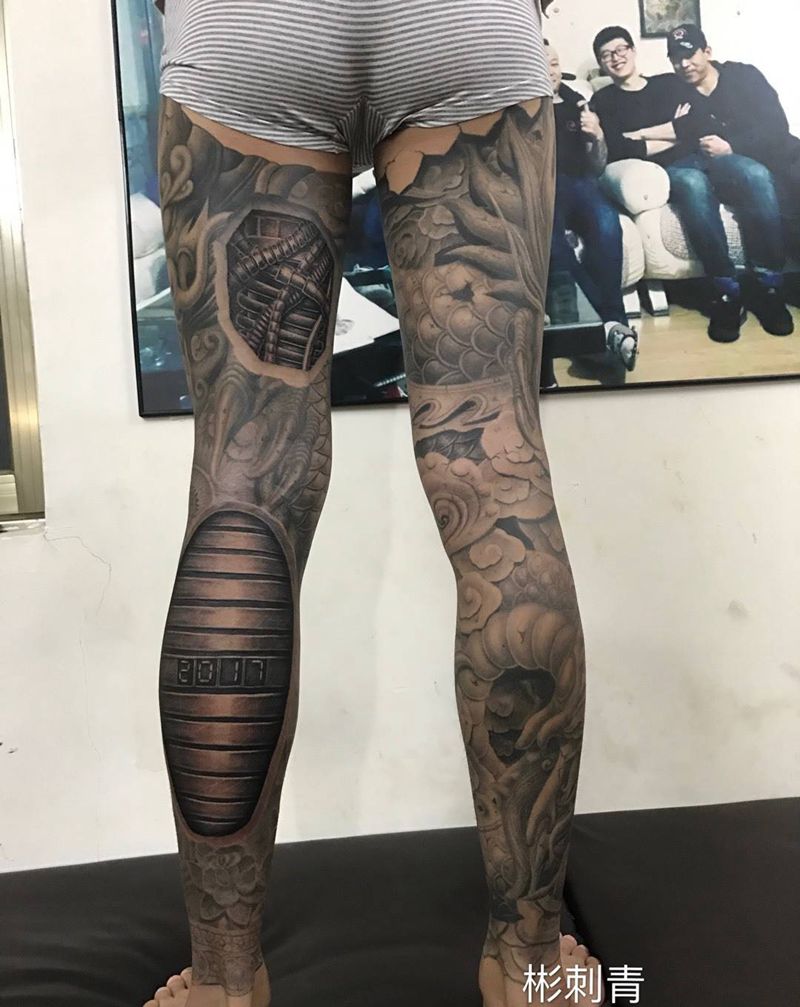 • T网红王老大花腿龙纹身图片_腿部新传统纹身图案