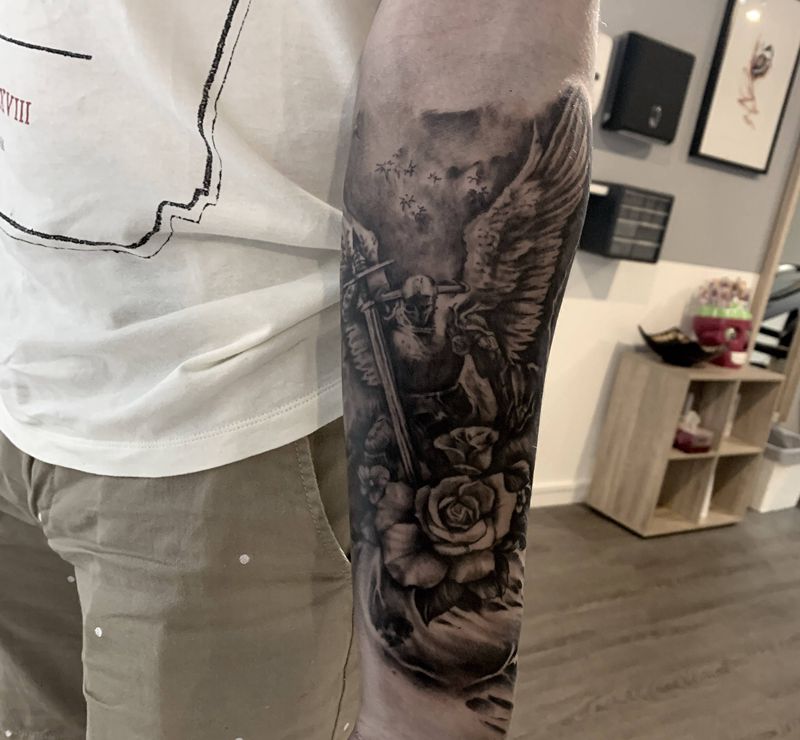 当前位置: 首页 >广东省广州市纹身店-广州RTattoo任刺青纹身图案>欧美写实纹身图片_手臂欧美写实水墨天使玫瑰写实勇士纹身图案