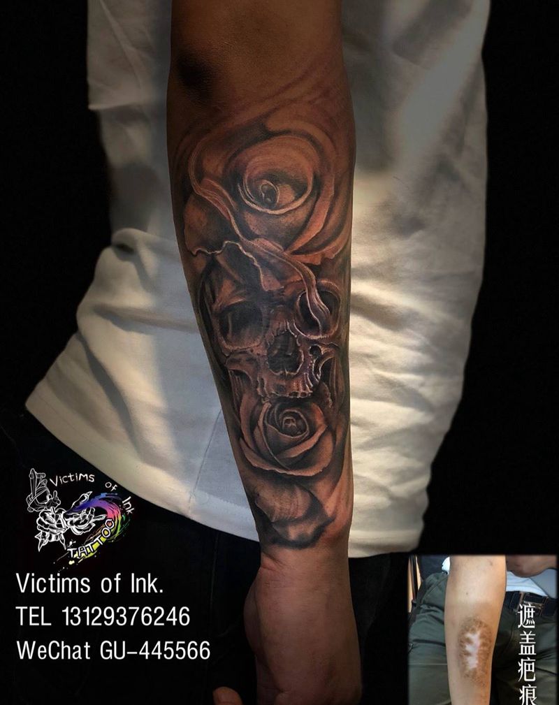 当前位置: 首页 >广东省广州市纹身店-Victims of ink纹身图案>骷髅玫瑰纹身图片_成品手臂写实原创纹身图案