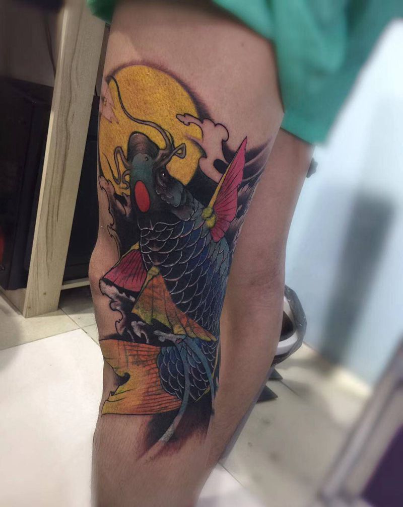 • T网红王老大花腿龙纹身图片_腿部新传统纹身图案