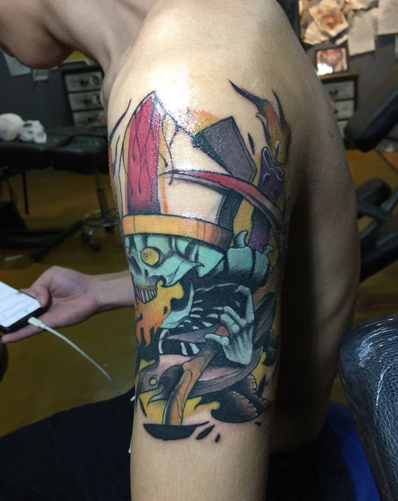 • T包小腿吹火男+阿多福纹身图片_腿部老传统新传统吹火男阿