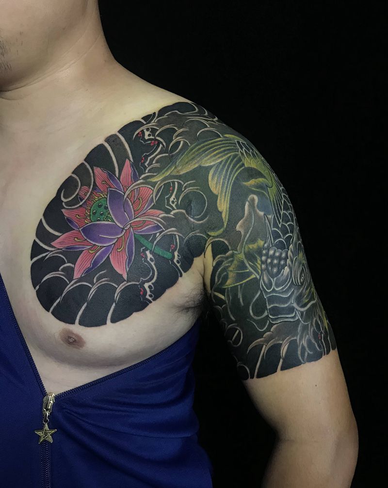 半甲修改纹身图片_手部胸部老传统鱼 荷花半甲纹身图案