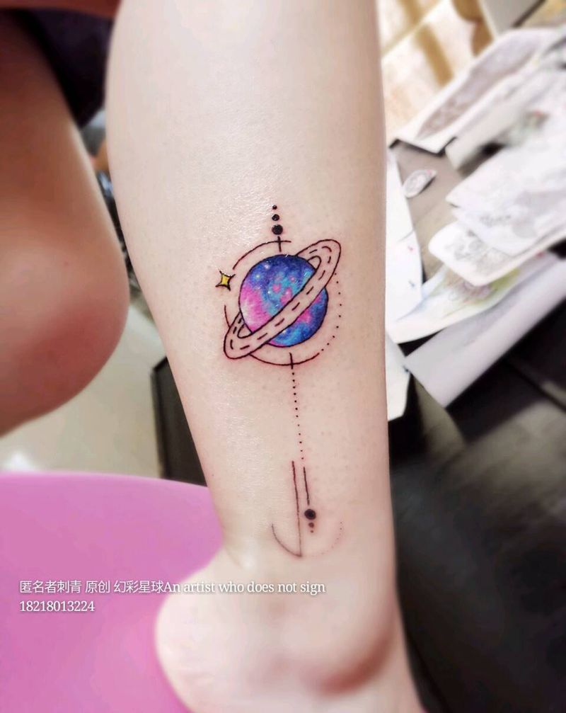 精工细作幻彩星球纹身图片_腿部欧美清新几何原创幻彩成品纹身图案