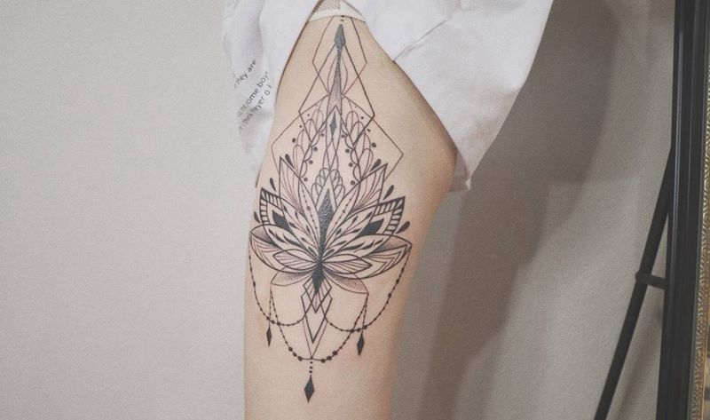 莲花纹身图片_腿部臀部几何点刺纹身图案