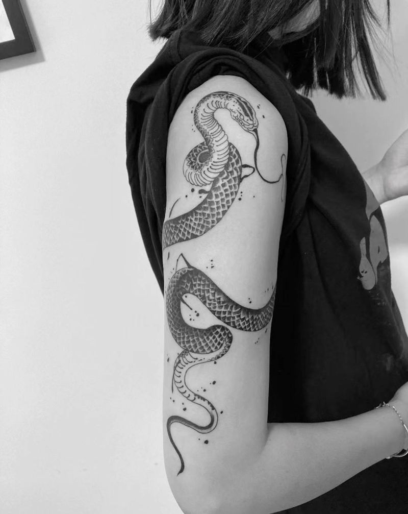当前位置: 首页 >广东省广州市纹身店-广州夜印刺青纹身图案>蛇纹身图片_手臂新传统纹身图案