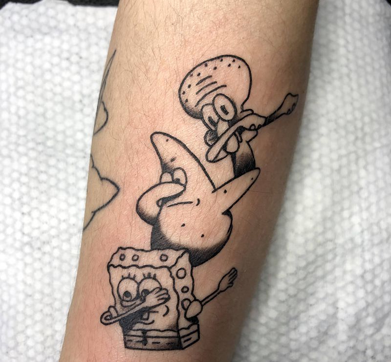 当前位置: 首页 >广东省广州市纹身店-忆刺青纹身图案>海绵宝宝 派大星  章鱼哥纹身图片_手臂纹身图案