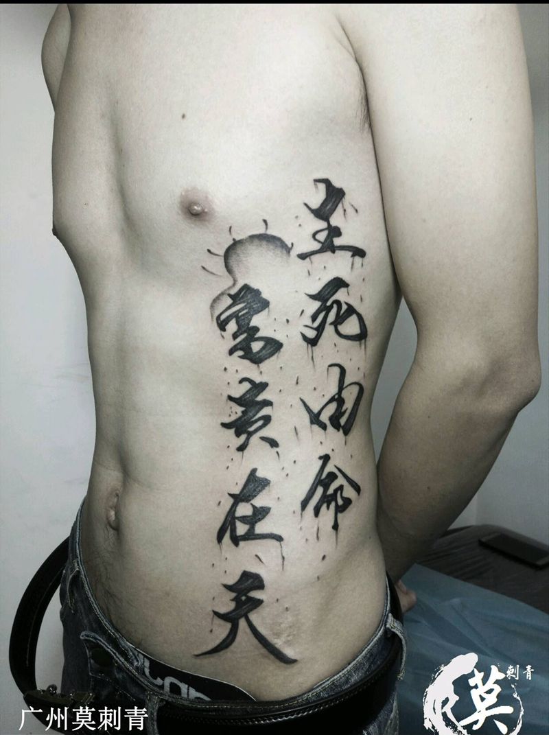 当前位置: 首页 >广东省广州市纹身店-广州莫刺青纹身图案>泼墨字体纹身图片_腹部腰部传统习俗写实国画字符成品手稿插画纹身图案