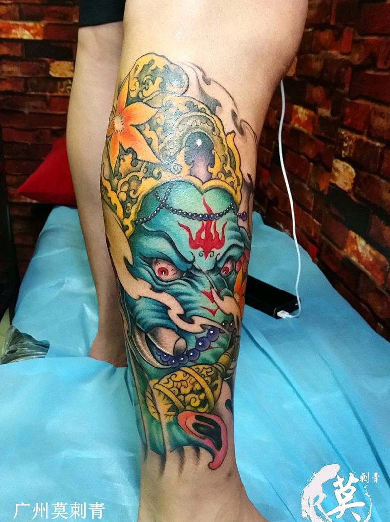 彩色象神纹身图片_腿部脚部新传统象神小腿彩色纹身图案