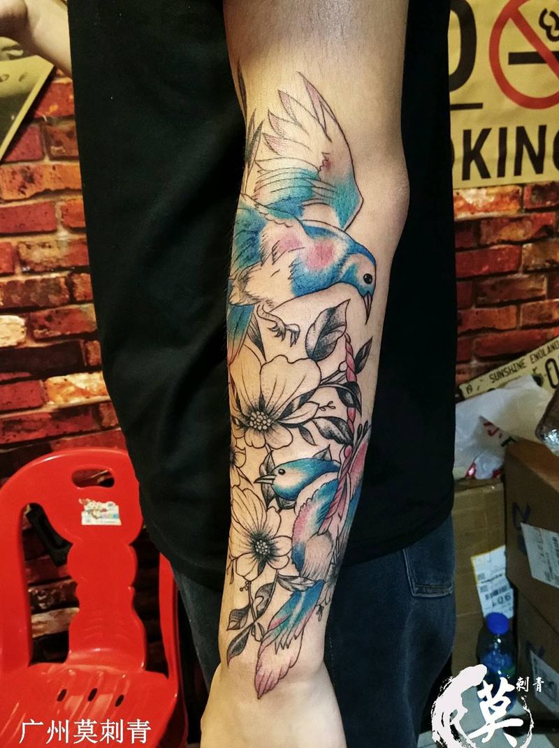 当前位置: 首页 >广东省广州市纹身店-广州莫刺青纹身图案>花鸟小臂纹身图片_手臂手部水彩花鸟纹身图案