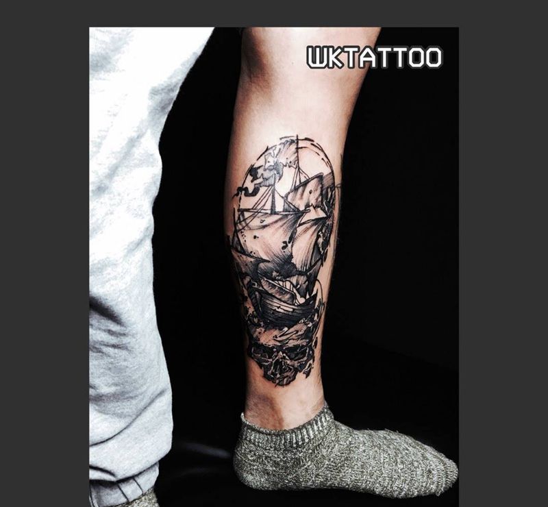 骷髅帆船纹身图片_欧美脚部成品纹身图案