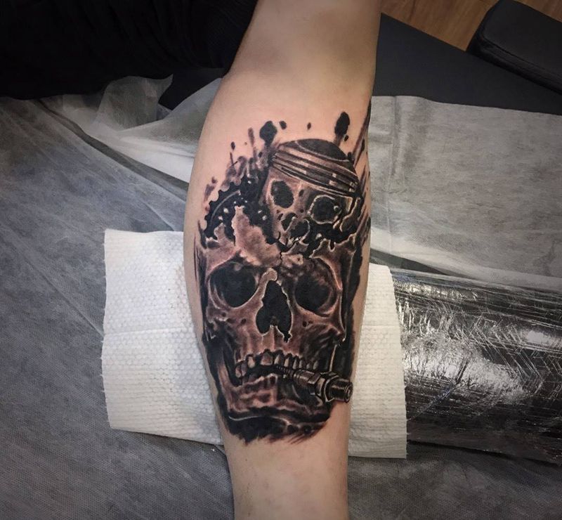 骷髅遮盖旧纹身纹身图片_腿部欧美写实纹身图案
