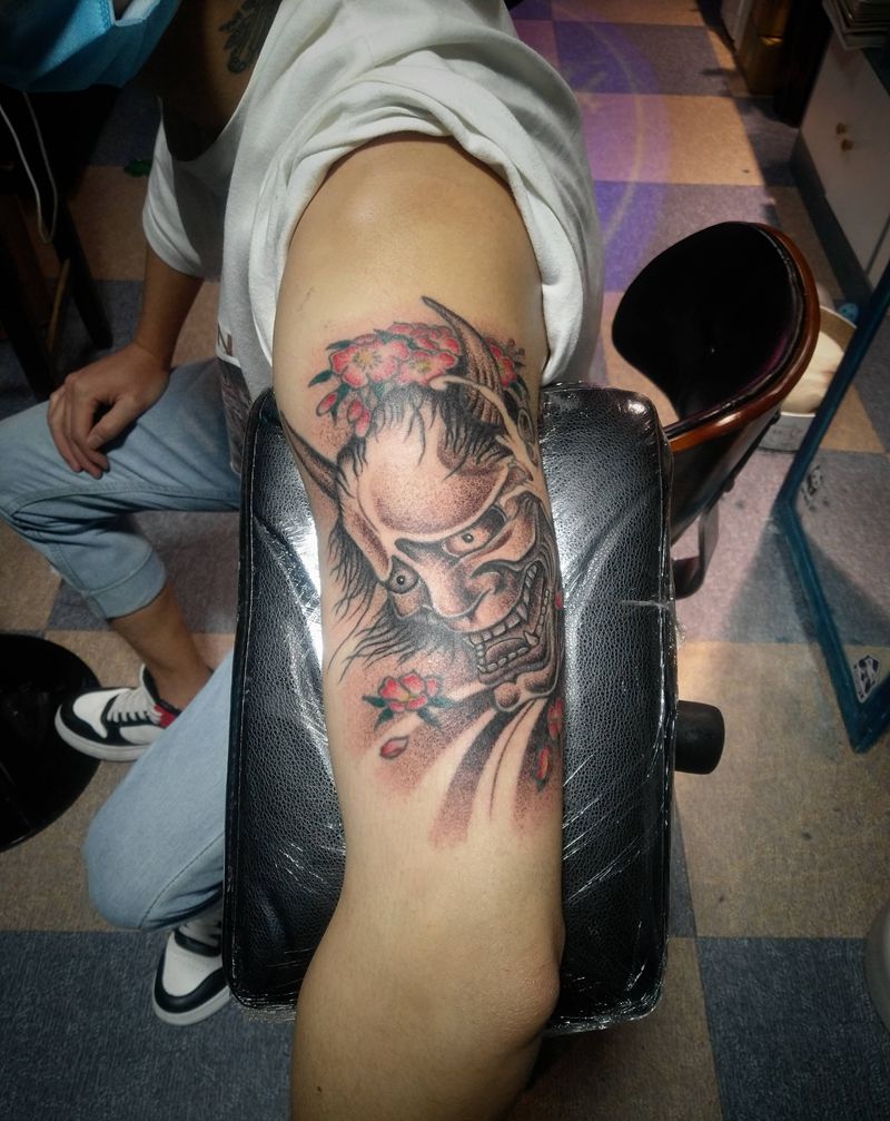 当前位置: 首页 >广东省广州市纹身店-周贰纹身工作室纹身图案>旧般若线条上色纹身图片_手臂新传统纹身图案