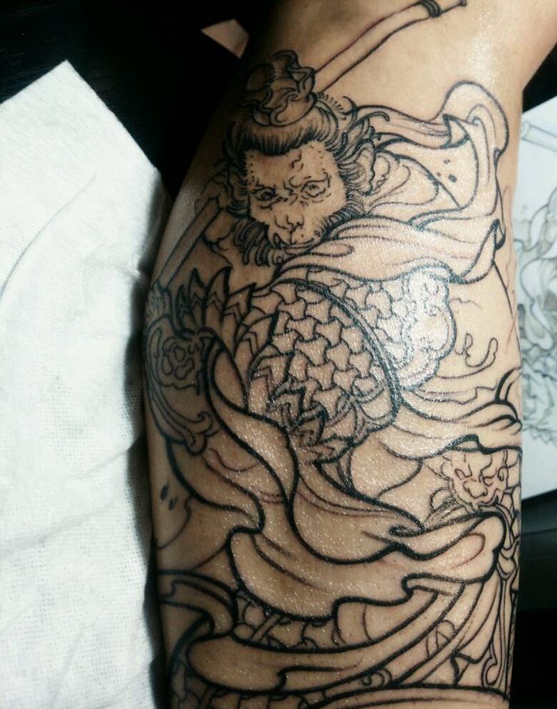 当前位置: 首页 >广东省广州市纹身店-Old duck tattoo纹身图案>大圣归来纹身图片_腿部传统国画鬼神唐日英LIFE成品纹身图案