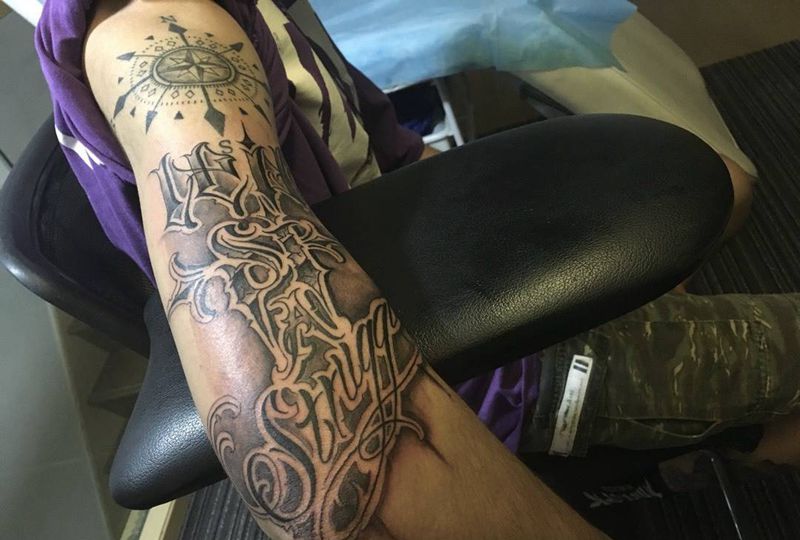 当前位置: 首页 >广东省广州市纹身店-Old duck tattoo纹身图案>花体纹身图片_花体字原创成品手臂保持圆寸欧美字符纹身图案