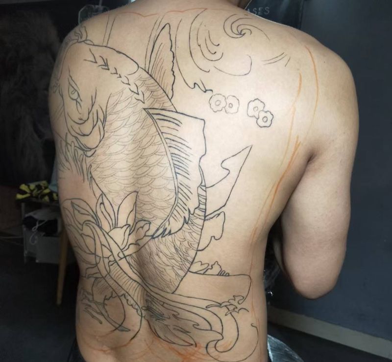 修改满背纹身图片_背部新传统老传统鲤鱼满背纹身图案