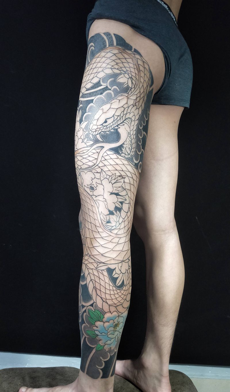 当前位置: 首页 >广东省广州市纹身店-纯针刺青工作室纹身图案>蛇戏牡丹花腿进度纹身图片_腿部老传统蛇花腿日式纹身图案
