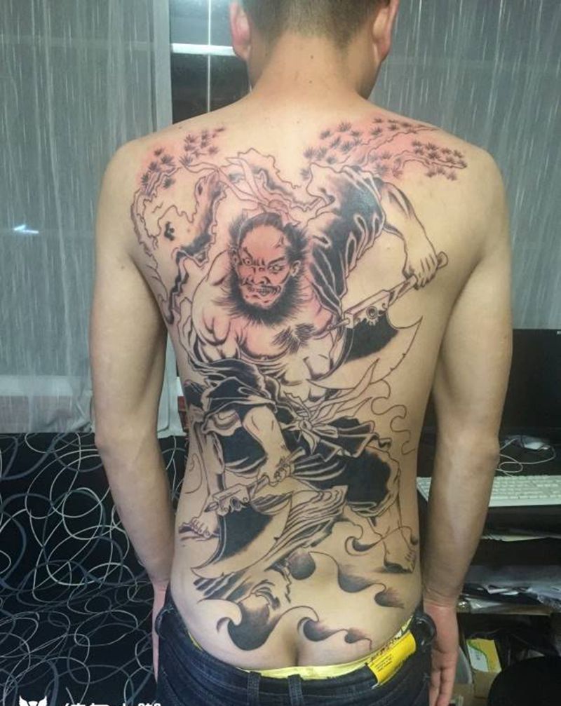 当前位置: 首页 >广东省广州市纹身店-纯针刺青工作室纹身图案>满背阔斧李逵纹身图片