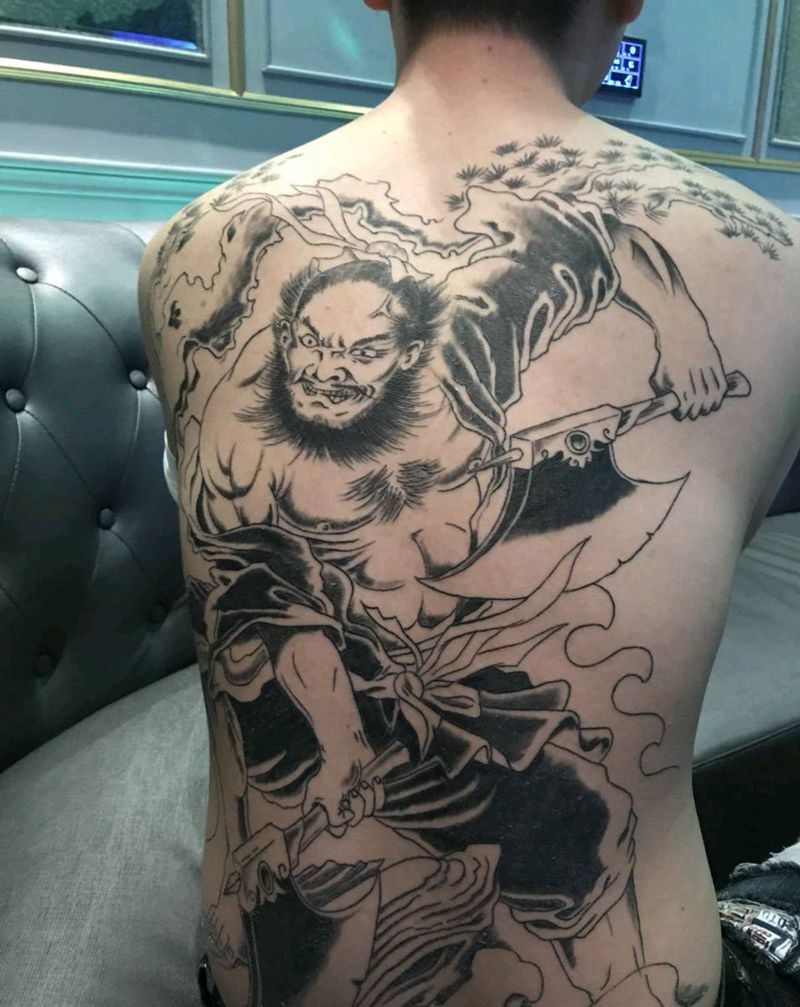 当前位置: 首页 >广东省广州市纹身店-纯针刺青工作室纹身图案>满背阔斧李逵纹身图片