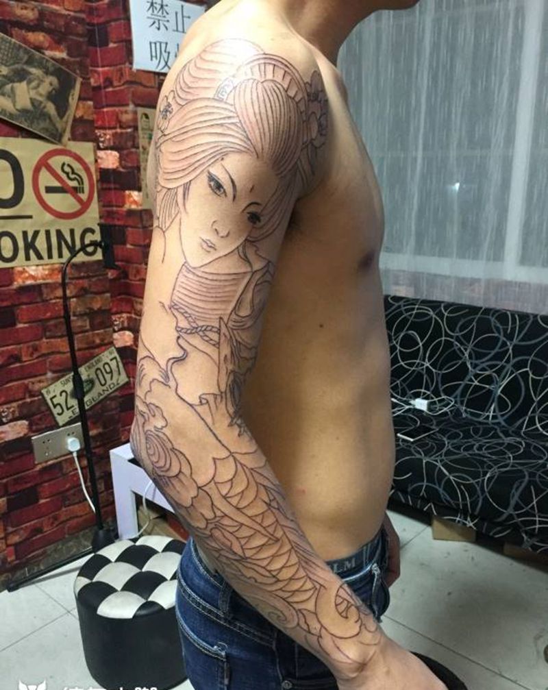 花臂艺妓龙鱼线条纹身图片_手臂新传统龙鱼艺妓花臂纹身图案