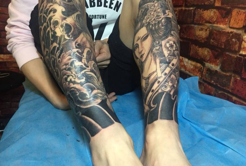 当前位置: 首页 >广东省广州市纹身店-纯针刺青工作室纹身图案>双明月艺伎完成纹身图片_新传统艺妓菊花浪花纹身图案