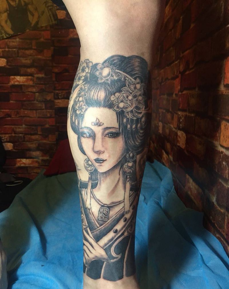 当前位置: 首页 >广东省广州市纹身店-纯针刺青工作室纹身图案>双明月艺伎完成纹身图片_新传统艺妓菊花浪花纹身图案