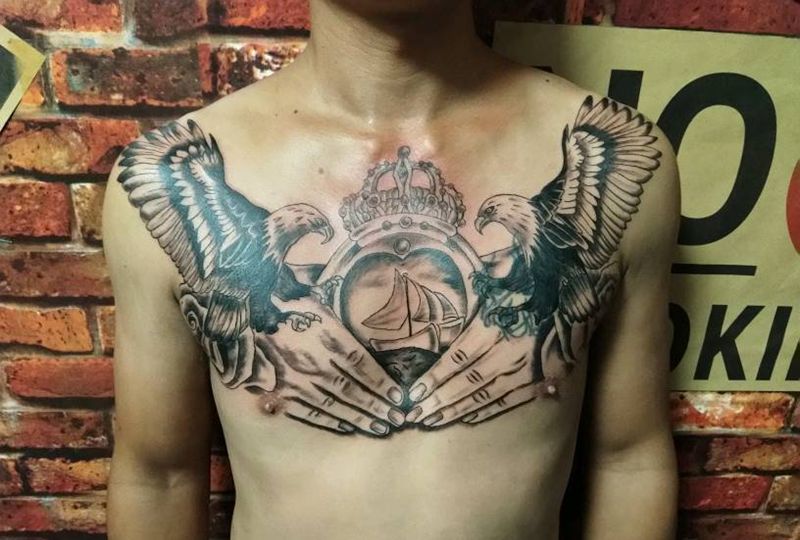 当前位置: 首页 >广东省广州市纹身店-纯针刺青工作室纹身图案>花胸遮盖,纹身图片_胸部欧美写实Old School遮盖鹰纹身图案