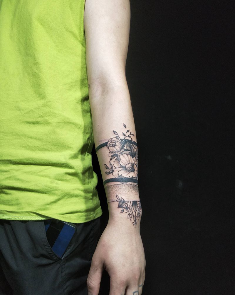 素花小臂纹身图片_手部点刺素花手环点刺纹身图案