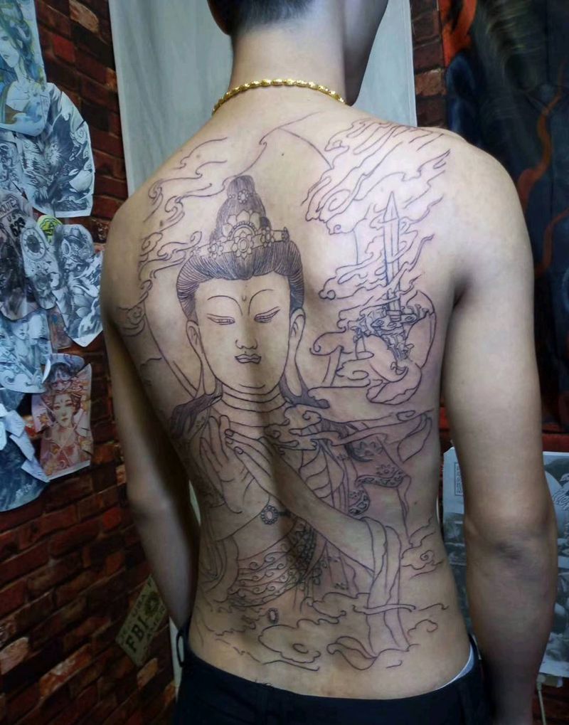 菩提线条纹身图片_背部新传统菩提纹身图案