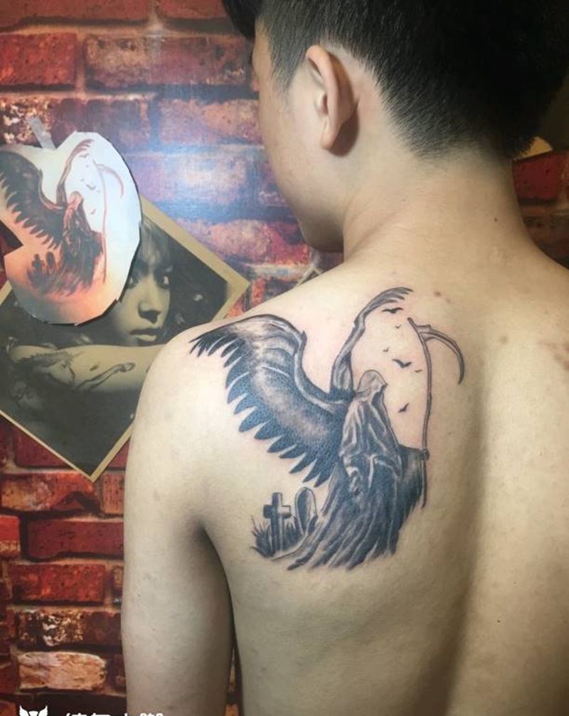后肩胛死神纹身图片_肩部欧美写实纹身图案